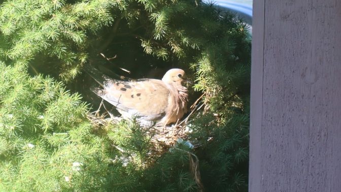 This summer, we had a pair of mourning doves set up house in a small tree right outside our front window. They had one “hatch” of two, then came back a couple of weeks later for round two. This time, I attempted to get photos of the chicks every day while they were still in the nest. The following is the result.