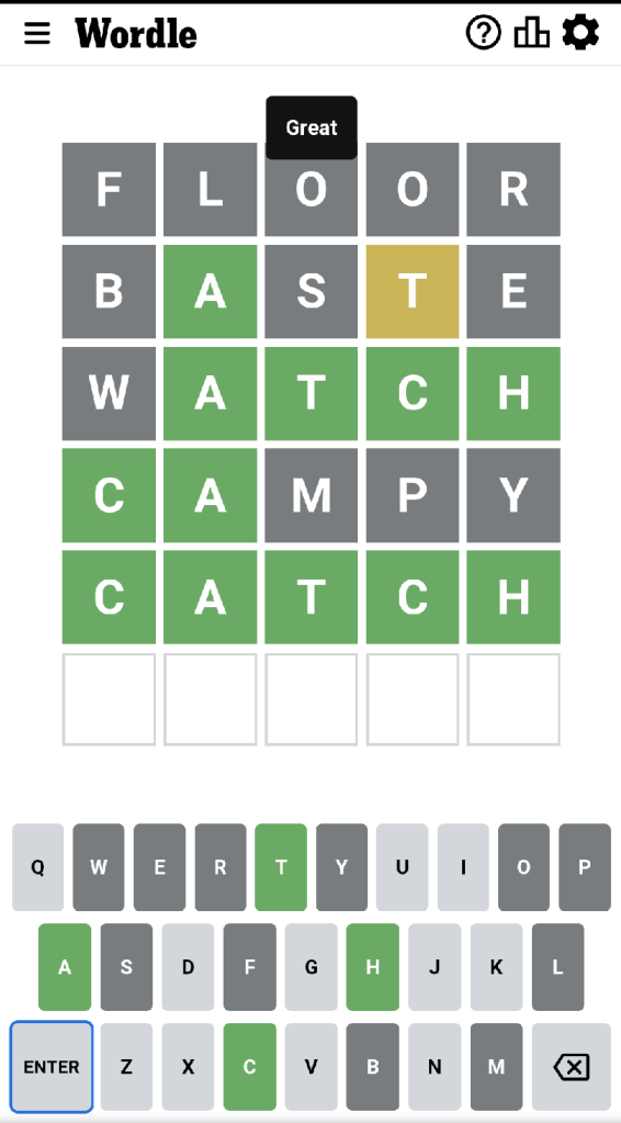 Line 4: Here’s the issue though. The word could be “catch”, “hatch”, “match”, or “patch”. I do not have enough guesses to guess all of these (though I think this would be the only thing allowed in hard mode). Instead, I play “campy” in order to see which of these letters should go in the first spot.