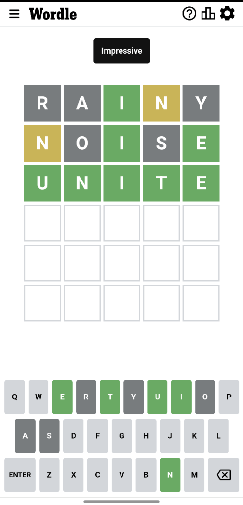 Line 3: Being as the “R” had already been used, I couldn’t think of anything quickly that would work with an “INE” because things like “brine” couldn’t be played. Yes, there was still words like “thine”, but I thought about whether the “N” could be played in the second spot, and the word “unite” jumped to mind, and it worked! 🙂 Truthfully, this wordle went so fast, I hardly remember playing it!