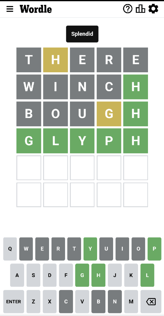 Line 4: So.. there is no “E” ” or “I” or “O” or “U”. I could either play a word here with “A” – though “graph” wouldn’t work because the “R” isn’t in the puzzle… And then I thought of an alternate with a “Y” as a vowel… “Glyph” – and it worked! This was a lot of fun! 🙂