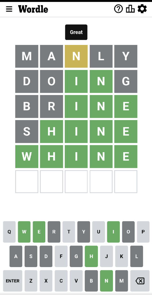 Line 2: This is good – not only did I find the place for the “N”, I got an “I” correct as well.