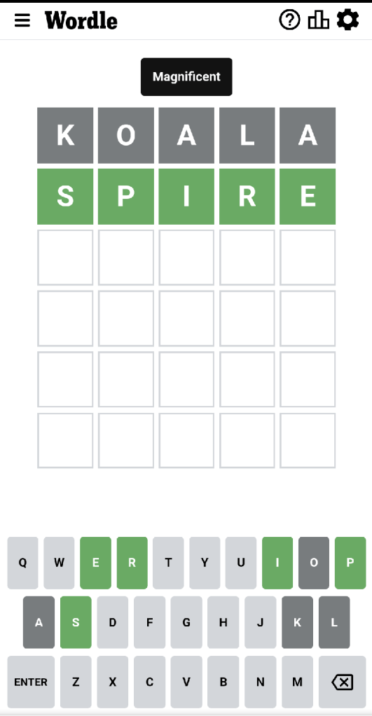 So… This shocked me completely. I wanted to play “S” and “E” but I didn’t go with “beast” because the “A” was already eliminated (twice). Since I was playing an “E”, I figured another vowel would be nice, I saw the “I”, and the first word that came to mind was “spire”.