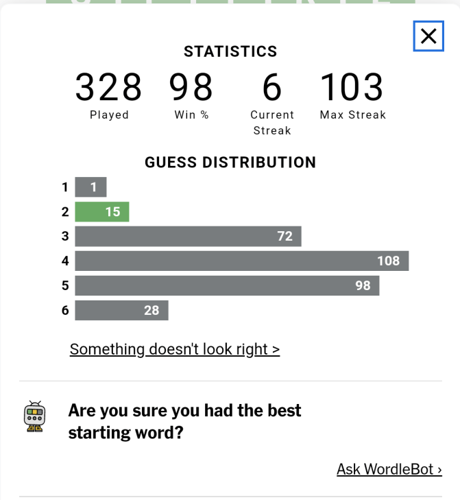 (P.S. As for the game with the “1” – way back at the beginning, my daughter said she had the Wordle answers for the next couple of years. I didn’t believe her, so when she said “play ‘x’ word,” I did, and it was correct. )