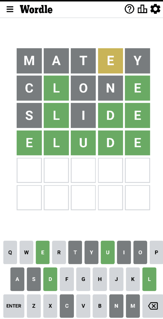 Line 4: Assuming the vowel in the middle is now “U”, it’s just a matter of figuring out which letter I haven’t tried to make a five-letter-word ending “LUDE”. “Elude” seemed the only choice.