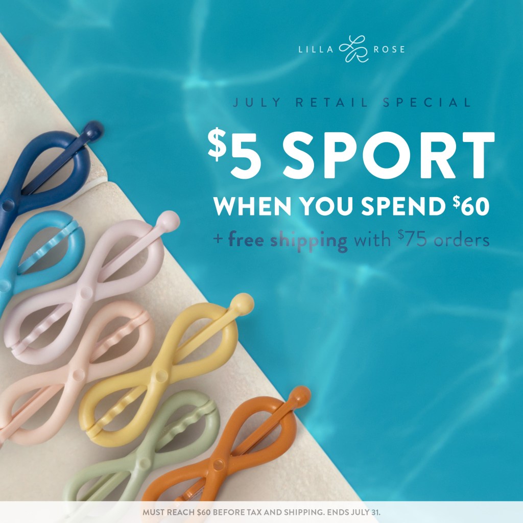 The monthly promotion: Get a Lilla Rose medium sport flexi for $5 when you spend $60 AND get free shipping with orders of $75 or more.