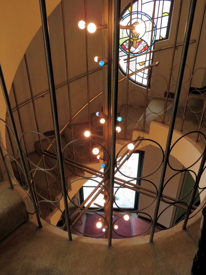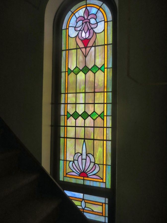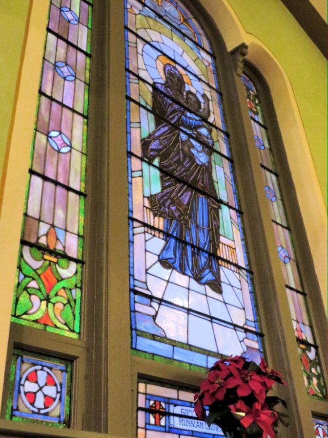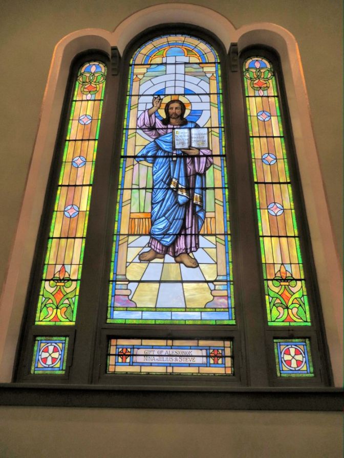 I think I agree with Andrew Gould. Even the stained glass windows that I like here, that aren’t too busy or bright, the ones that let in a lot of light and don’t clash with the more subtle icons, don’t seem fitting in an Orthodox church. Our fresco painter explained once — I will have to ask him again — why we don’t have big windows and views of the outdoors, why it’s actually better to be “in the dark,” sort of….
