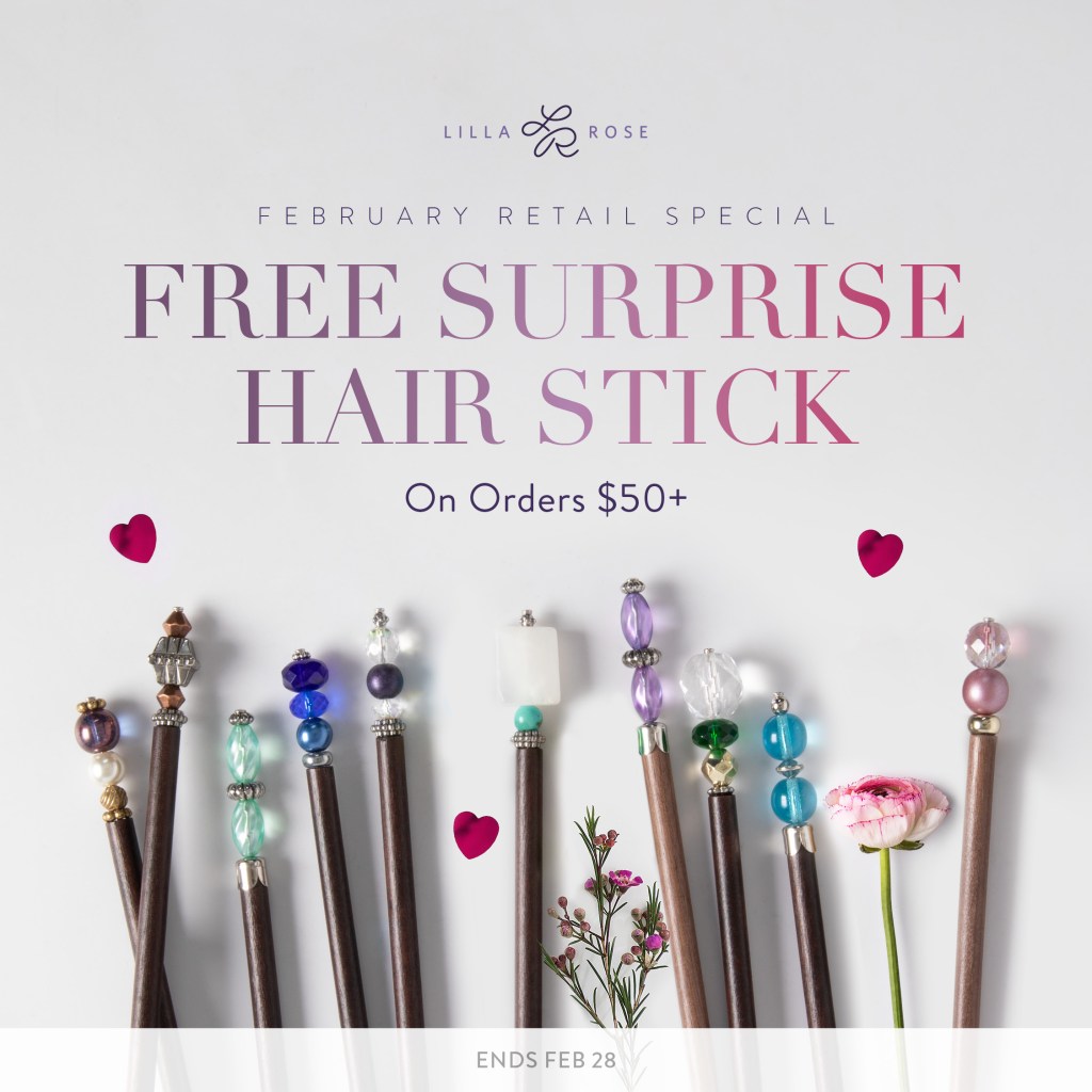 This month’s retail promotion is a free surprise hair stick with orders of $50 or more.