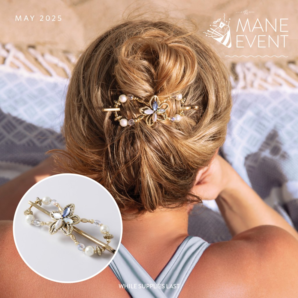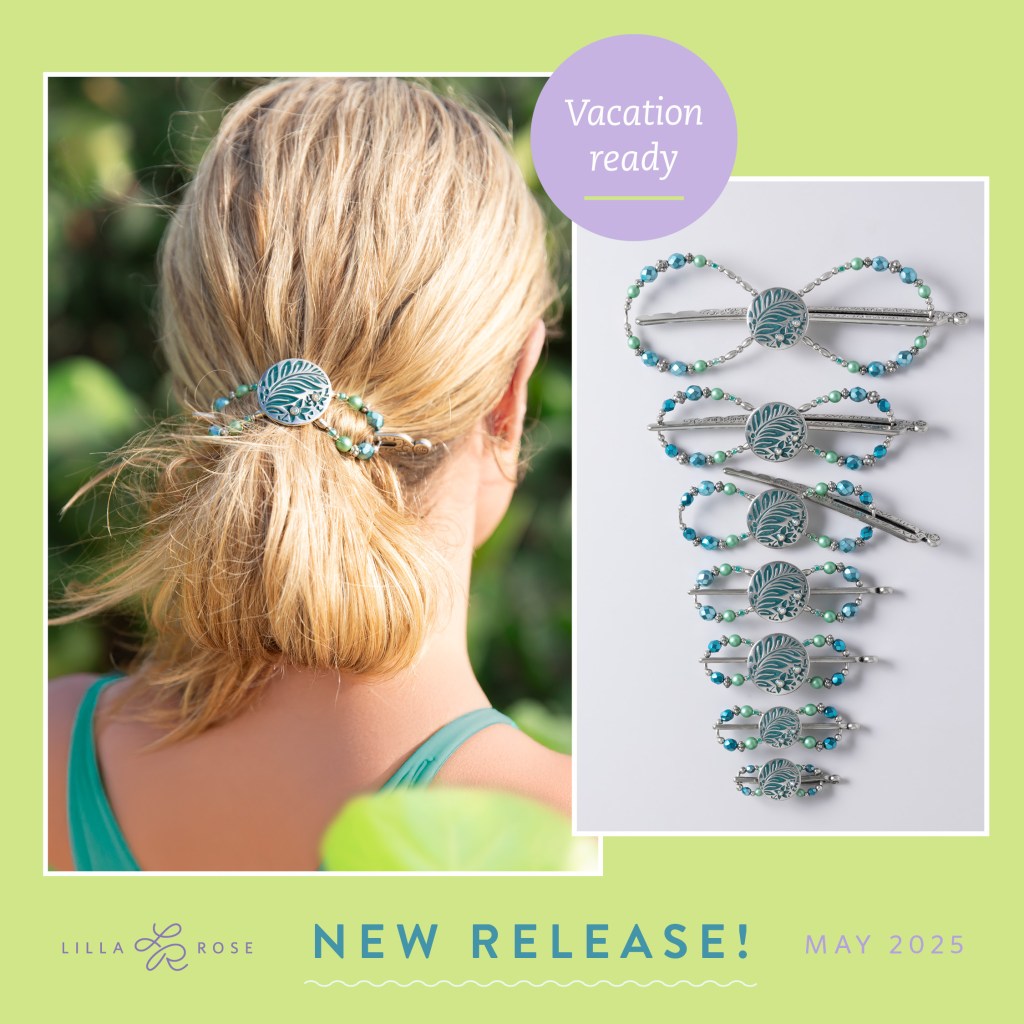 May’s other big “new release” is “Talia”, and as you can see, there’s definitely a vibe of getting ready to go out and enjoy time in the sun. (Outside my window is overcast and 45F, so… maybe not today.) The Lilla Rose clips like this are really quite sturdy, and can take wet hair easily without getting damaged.